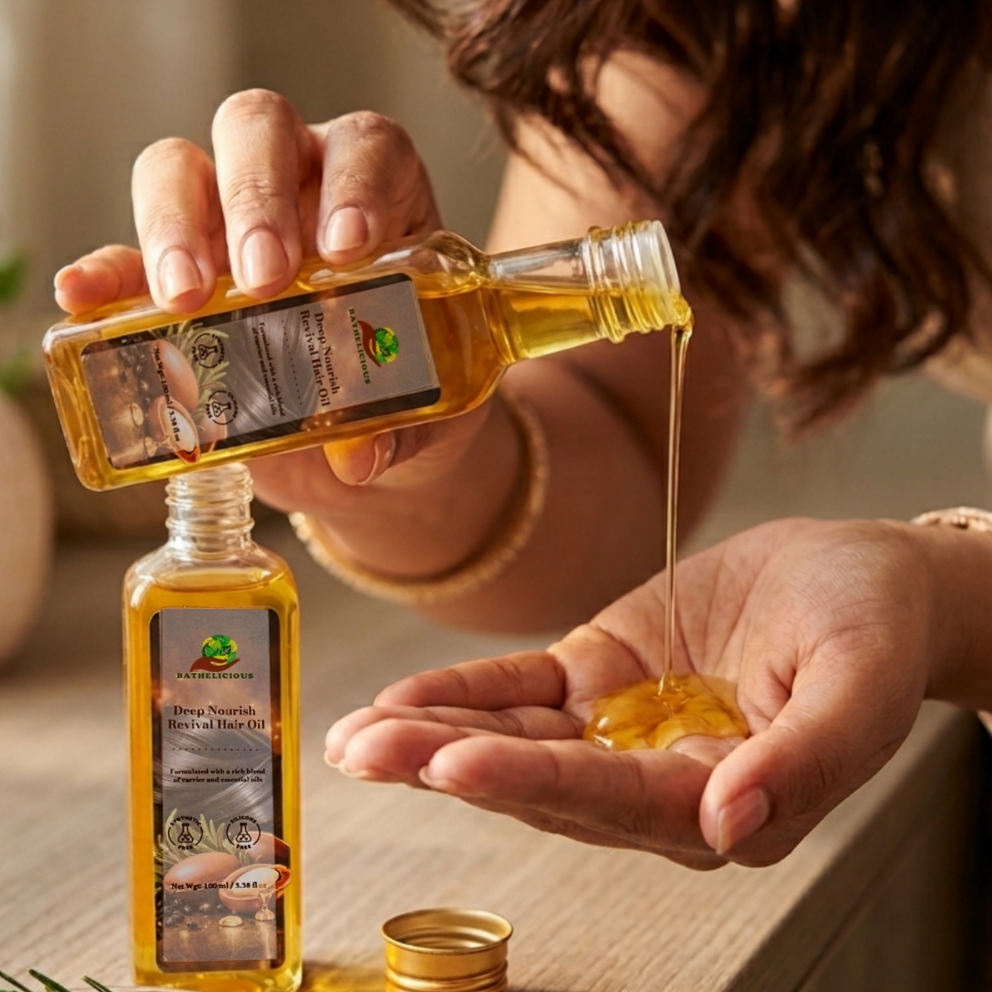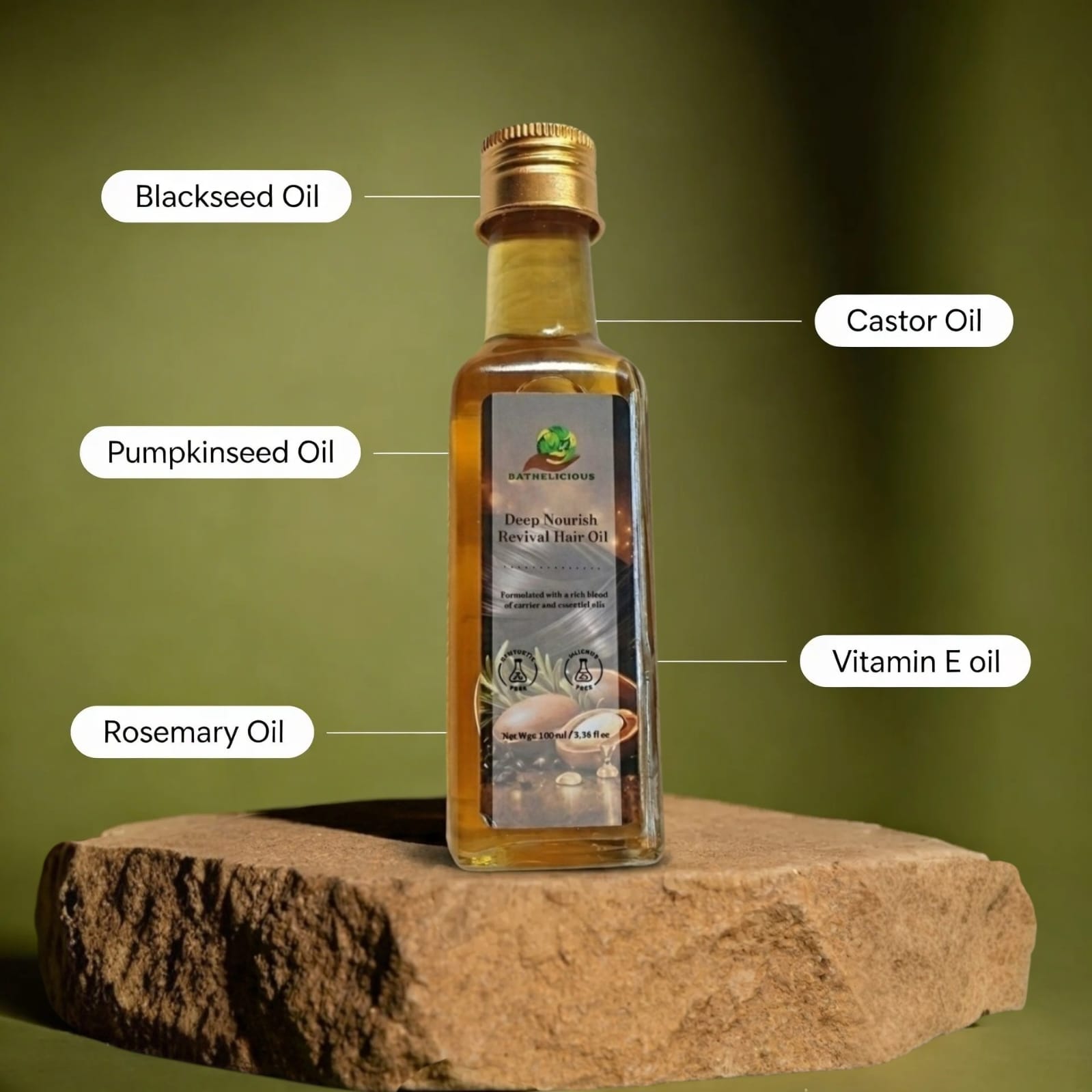 Bathelicious Deep Nourish Revival Hair Oil is more than just a routine—it’s a ritual that restores life to stressed, dull hair from root to tip. Infused with the powerful synergy of pumpkin seed oil, black seed oil, and rosemary oil, it works at the scalp level to revive follicles while deeply conditioning the strands. Pumpkin seed oil is rich in zinc and essential fatty acids that help reduce hair fall and support stronger, thicker growth. Black seed oil, often called the “seed of blessing,” is packed with antioxidants that soothe scalp irritation, fight dandruff, and improve overall hair health. Rosemary oil stimulates blood circulation to the scalp, encouraging faster growth and adding natural shine and volume. Together, this blend delivers intense hydration, strengthens roots, and transforms dry, lifeless hair into soft, resilient, and visibly healthier locks. 🌿